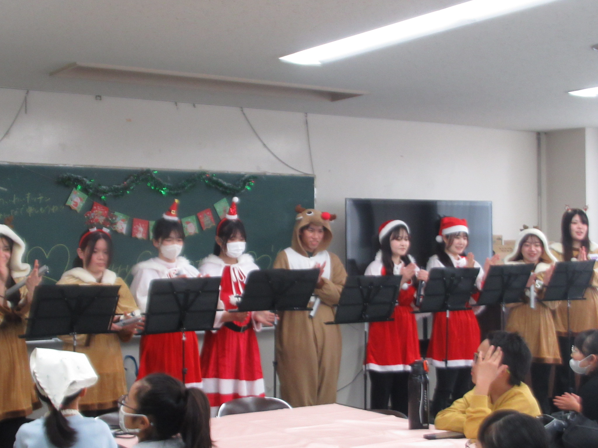 食後には、サンタとトナカイの衣装を着た大学生がハンドベルコンサートを開いてくれ、クリスマス気分を盛り上げてくれました。